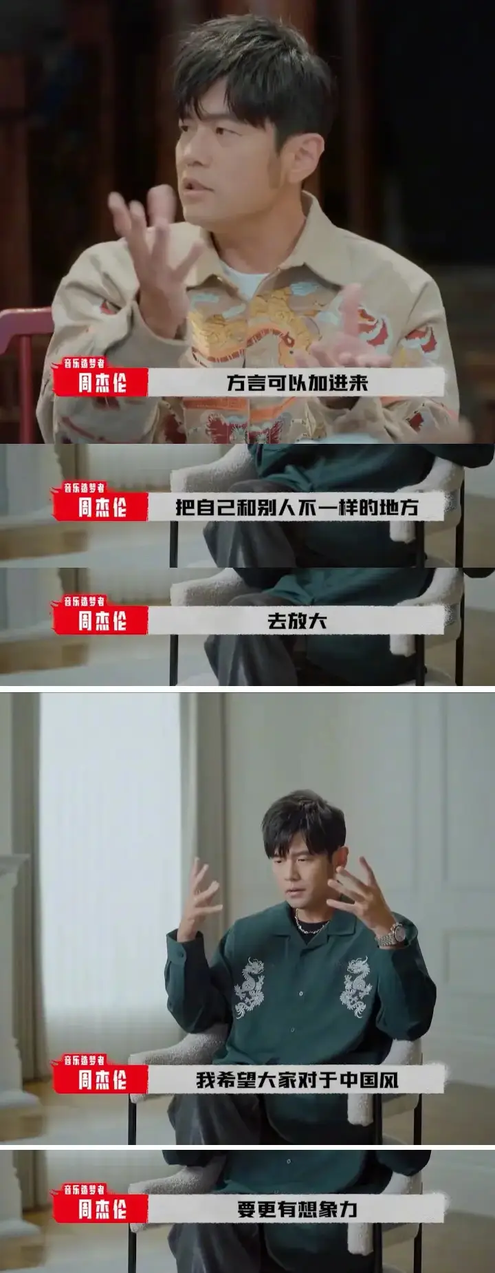 周杰倫還表示:“我希望大家對于中國風(fēng)要更有想象力,就是不只有歌詞上面,然后配樂上面,編曲上面,要怎么跟別人不一樣,要加怎么樣的民族樂器在里面,要怎么樣的方言在里面,可能一把吉他,簡簡單單的,它也可以是很有魅力的。”