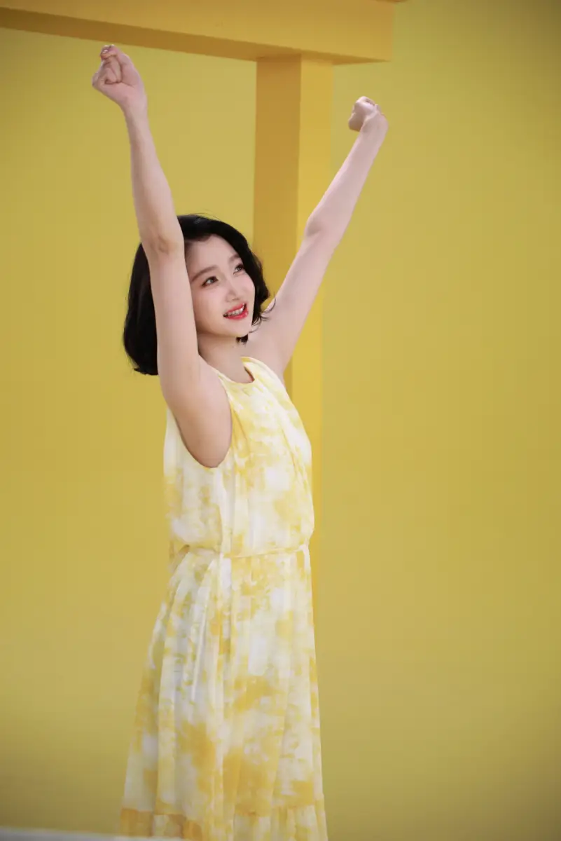 關(guān)曉彤著鵝黃色連衣裙元氣甜美 莞爾淺笑像瓷娃娃