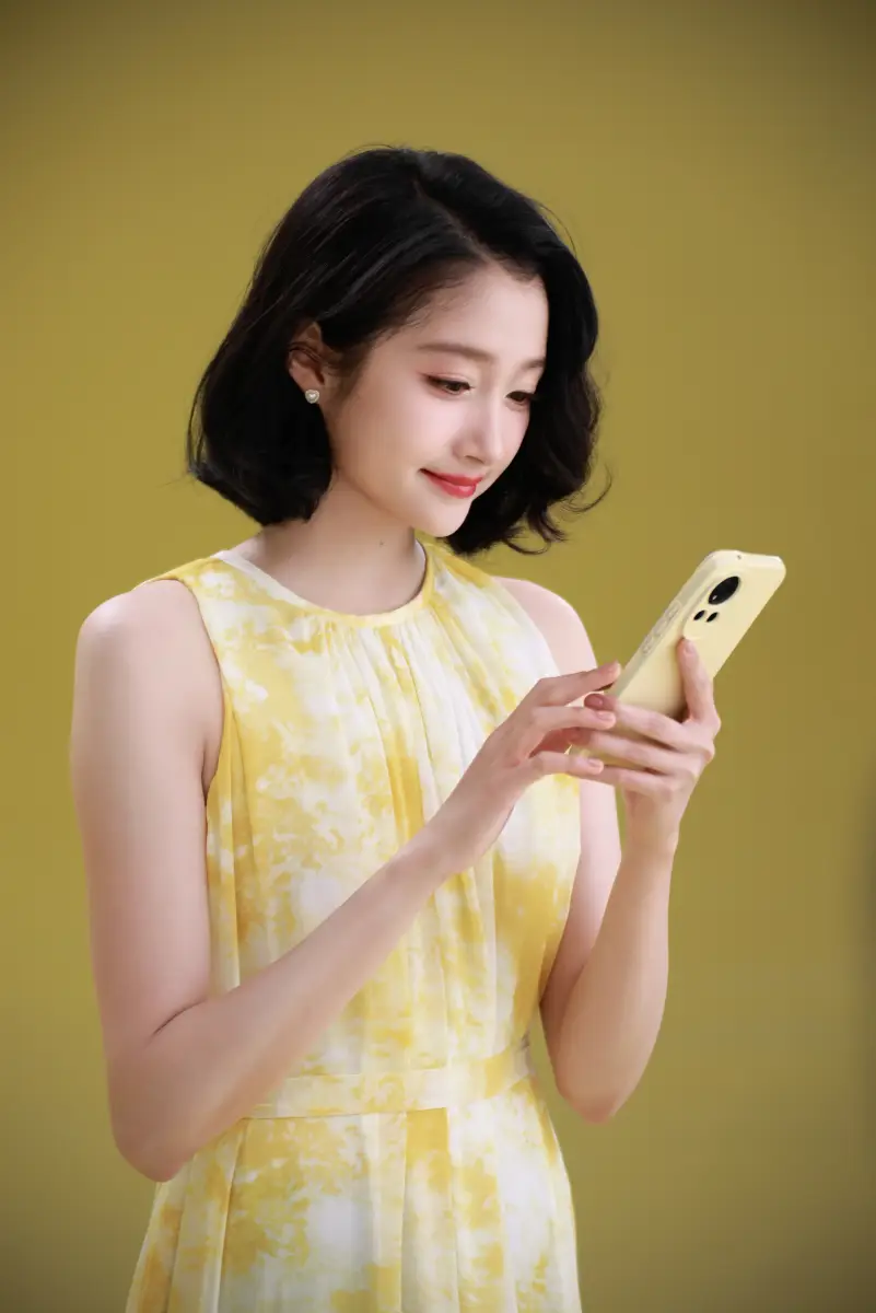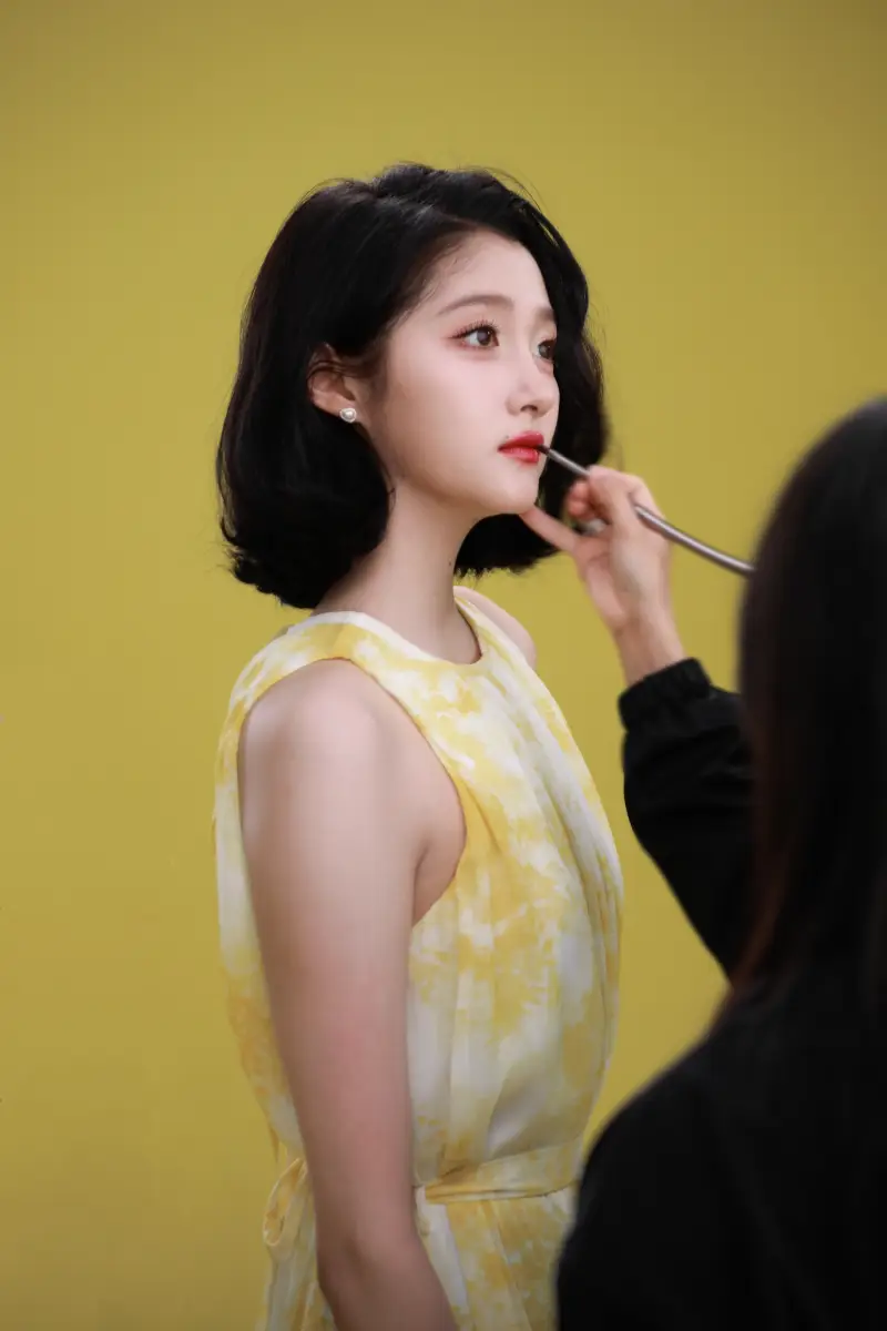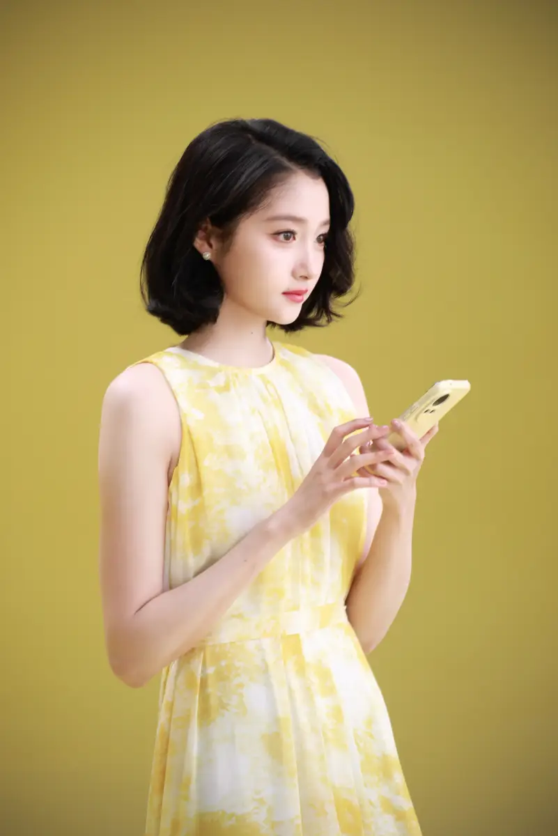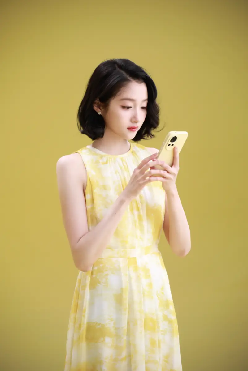 關(guān)曉彤穿著鵝黃色的連衣裙,中長卷發(fā)顯得略微有些成熟。