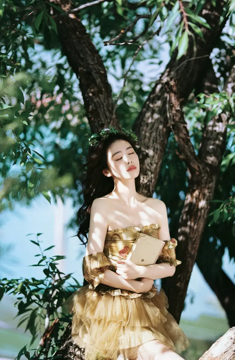 7月1日,一組白鹿(明星經(jīng)紀(jì)公司)身穿復(fù)古抹胸裙的寫真照片釋出,她坐在樹上看書,宛如守護(hù)森林的仙子。