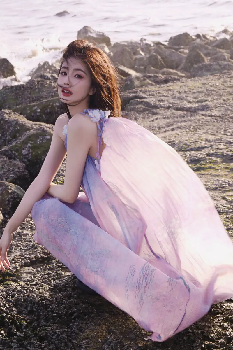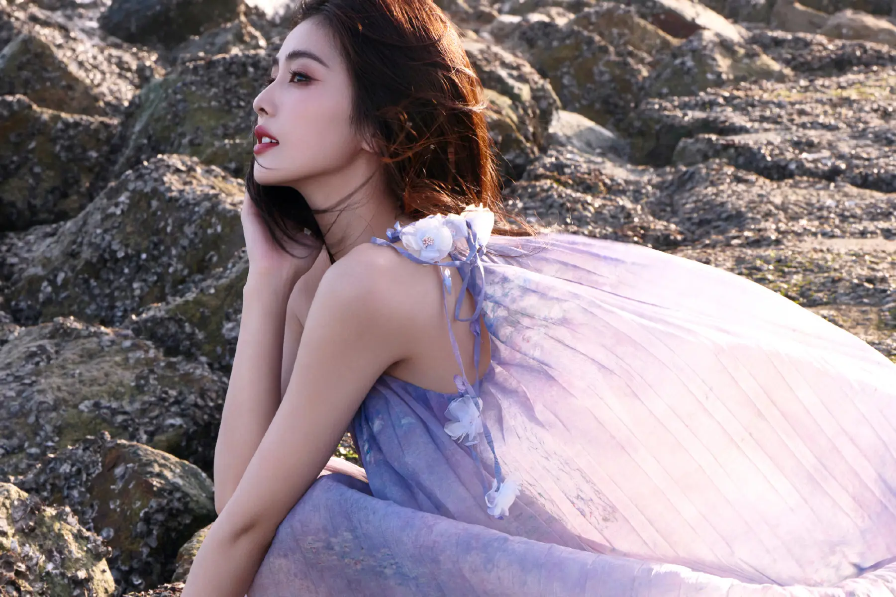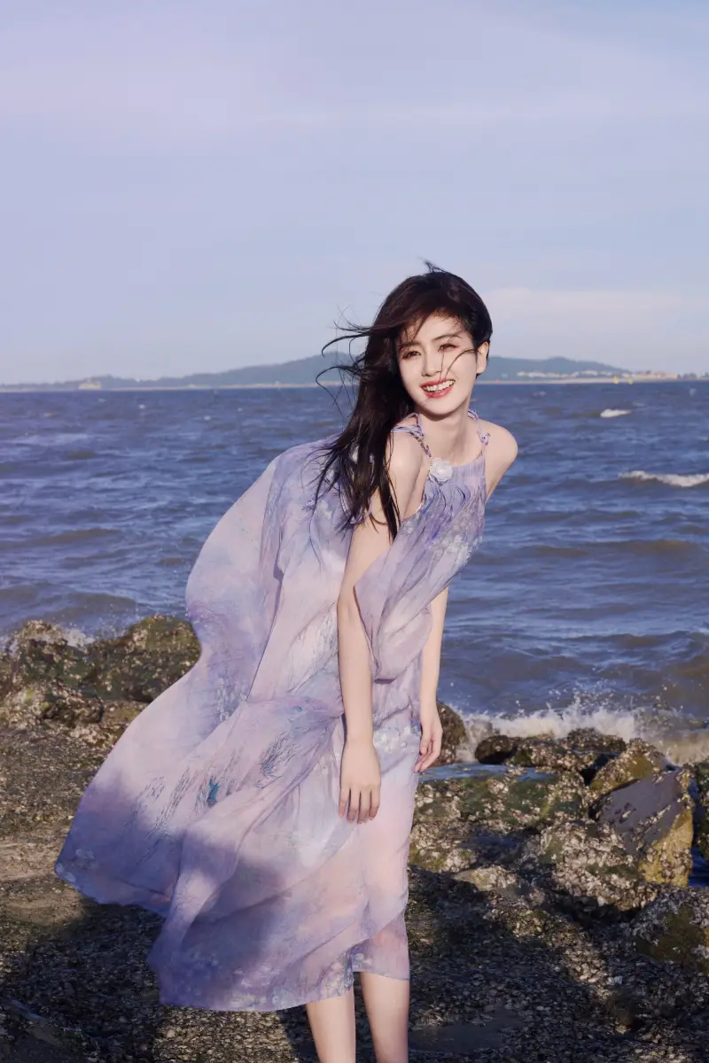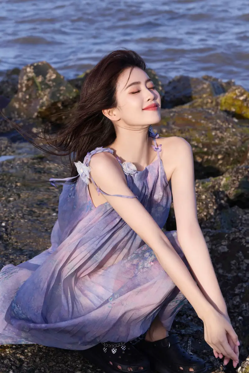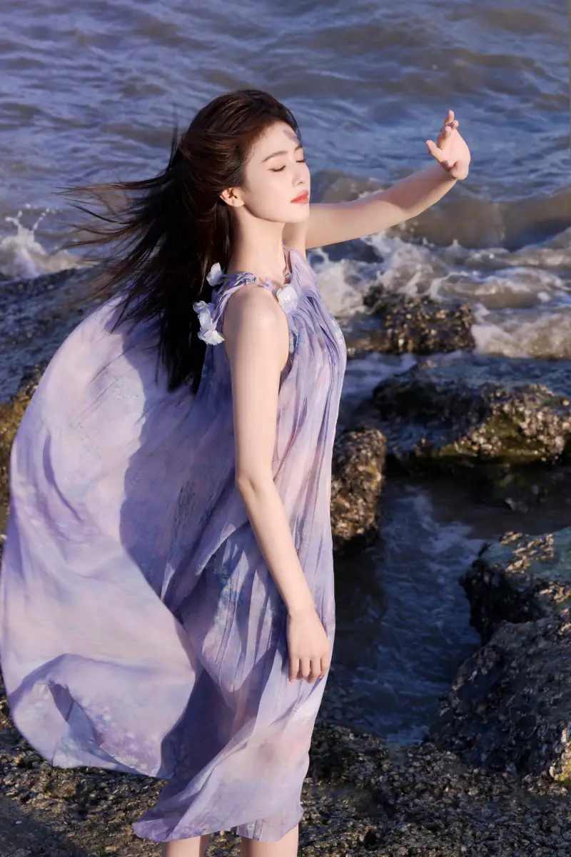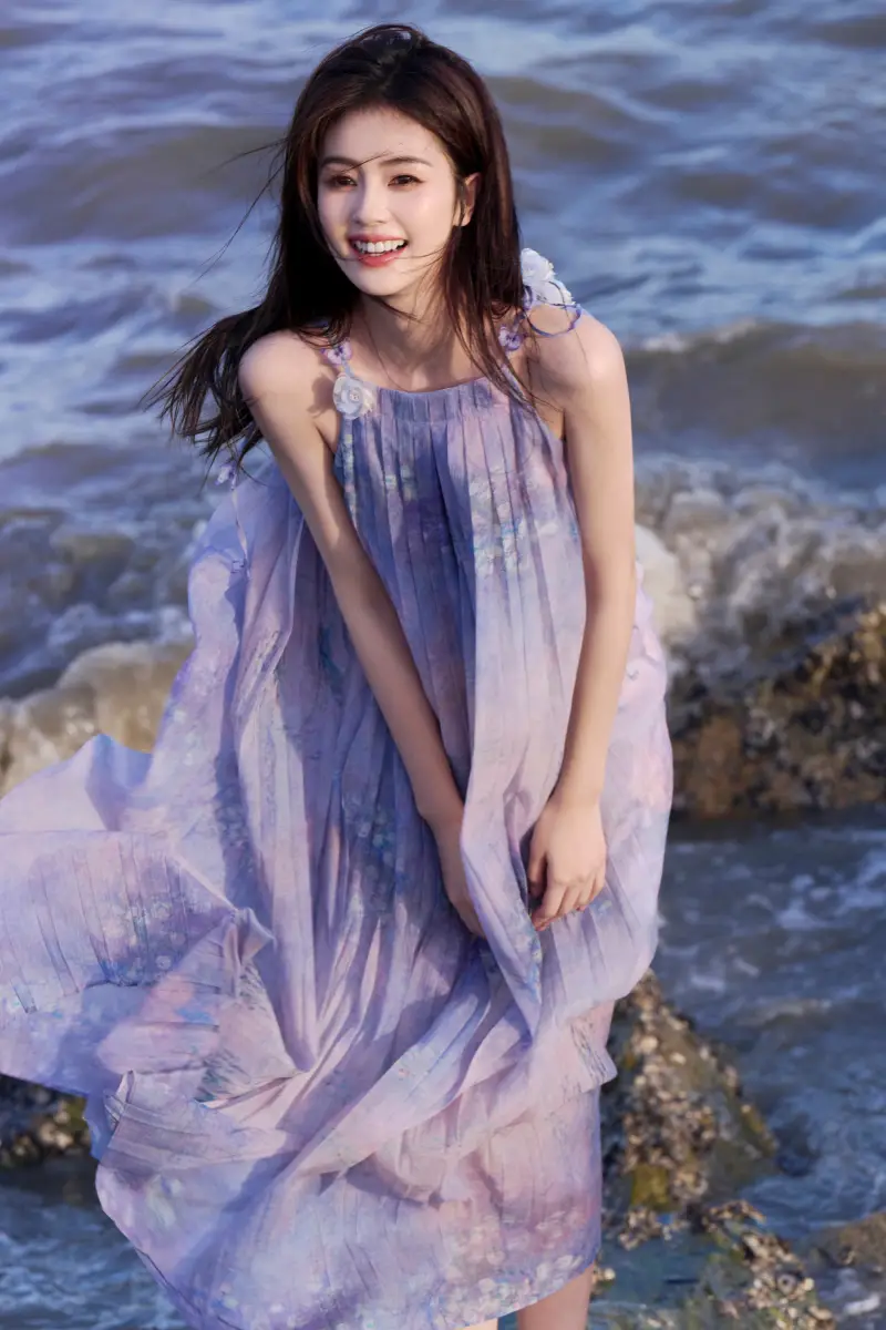 白鹿穿紫色紗裙海邊漫步 側(cè)身燦笑明媚如陽(yáng)光