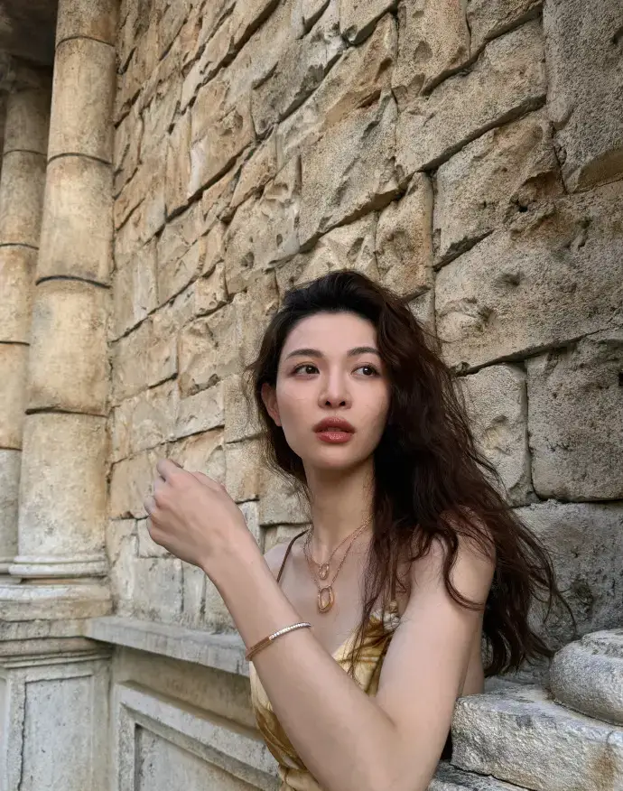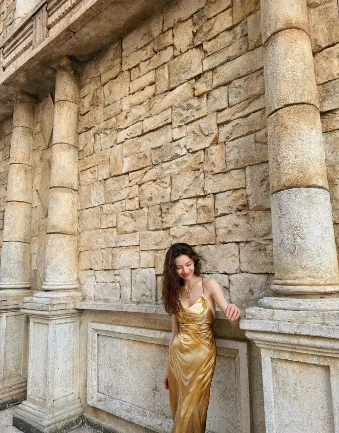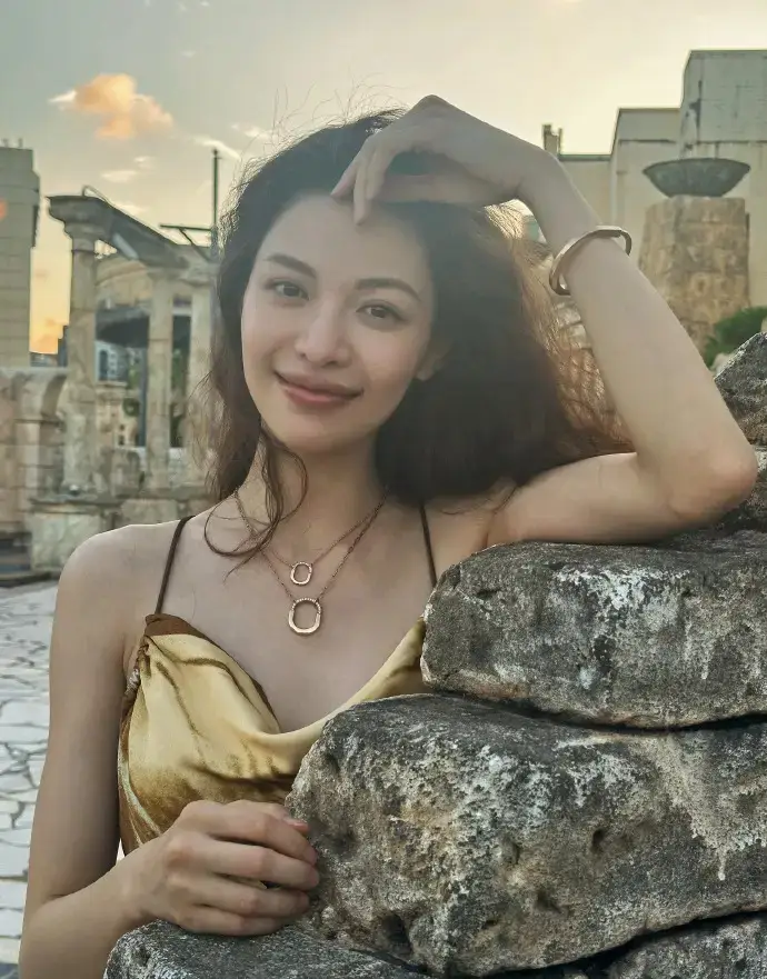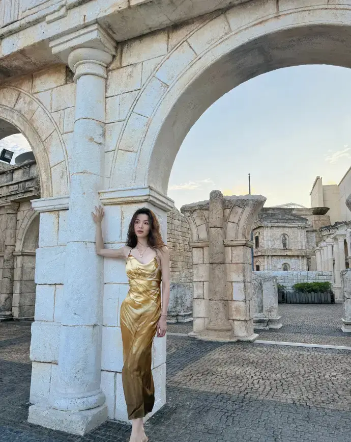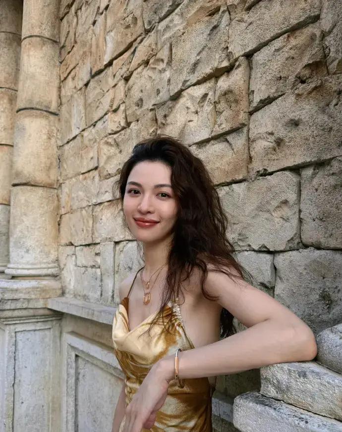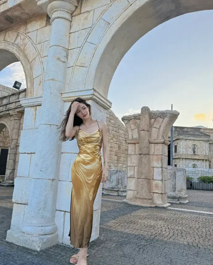 鐘楚曦穿金色吊帶裙漫步澳門 夕陽下微笑氣質(zhì)卓越