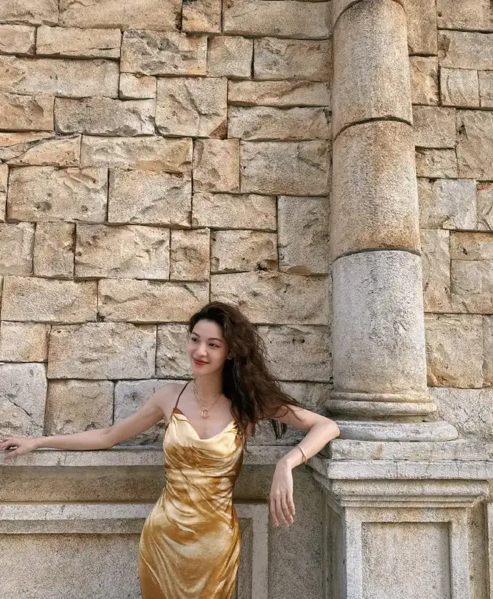 鐘楚曦身穿金色吊帶裙。