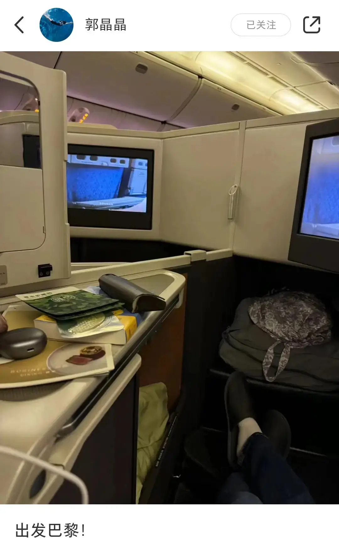 25日,郭晶晶(明星經紀公司)在社交平臺上發(fā)文宣布“出發(fā)巴黎”,并配上了自己乘坐飛機的照片,狀態(tài)十分愜意。此前,郭晶晶在接受采訪時表示,自己會以跳水裁判的身份參與巴黎奧運會。