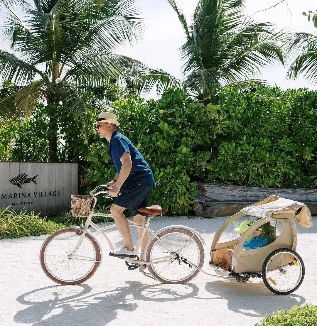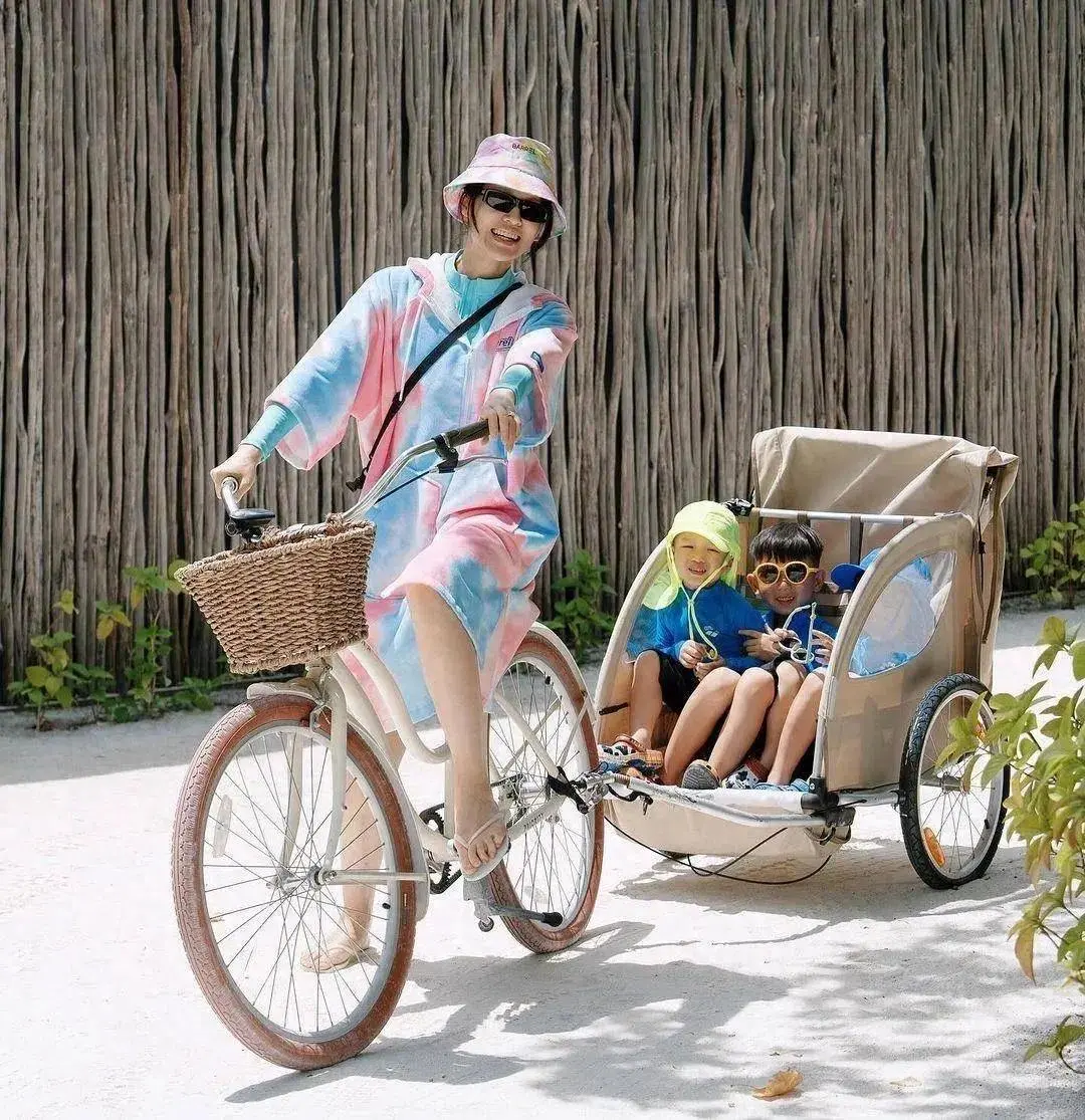 除了下海游泳,他們一家五口還在沙灘騎車,胡杏兒和老公負責當車夫,三個兒子坐在后面,畫面非常溫馨。