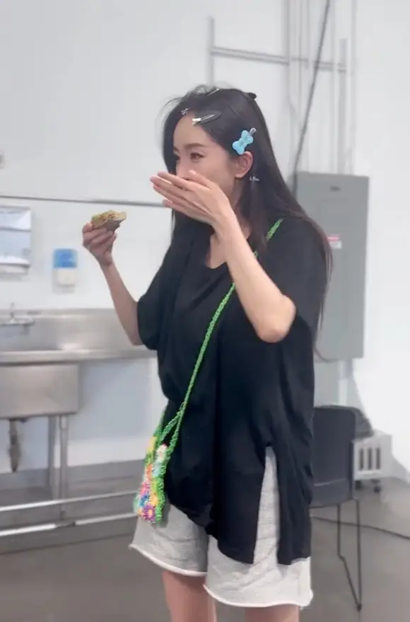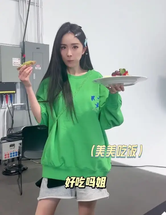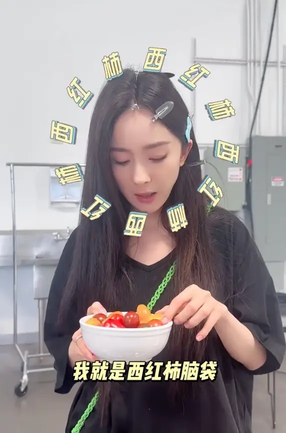 楊冪工作前大口吃番茄 穿格子衫單腳立活潑可愛
