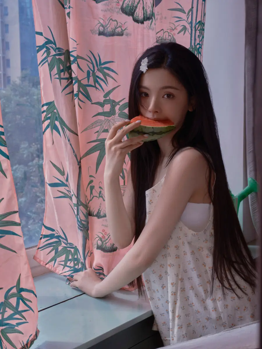8月2日,楊超越(明星經(jīng)紀(jì)公司)在社交平臺(tái)上曬出一組夏日居家美照,她身穿黃色印花吊帶睡衣,搖蒲扇、吃西瓜,十分可愛(ài)甜美,少女感滿滿。