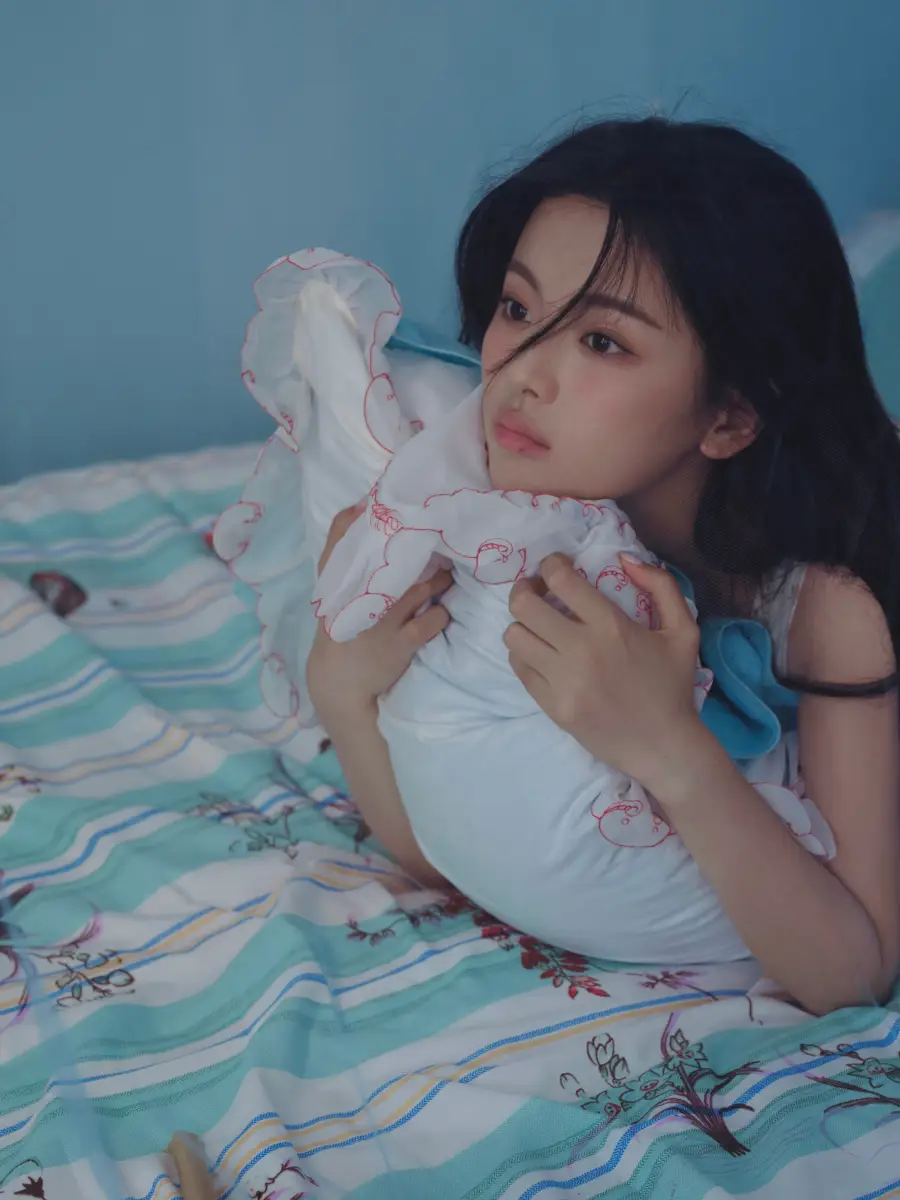 楊超越抱著枕頭的樣子就像小女孩一樣,超可愛(ài)。