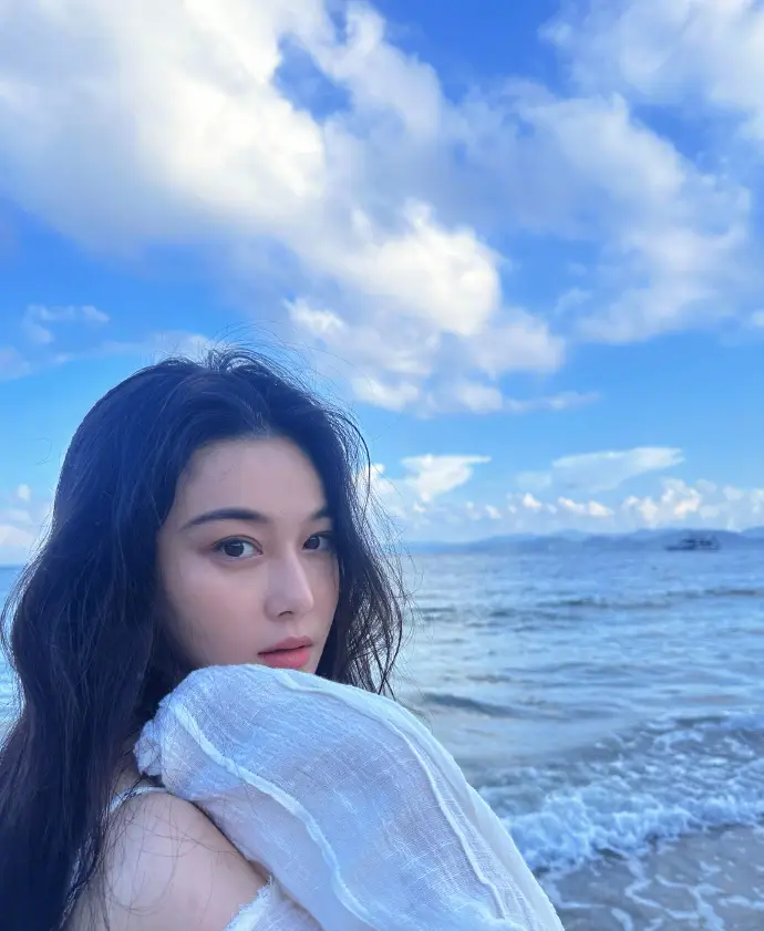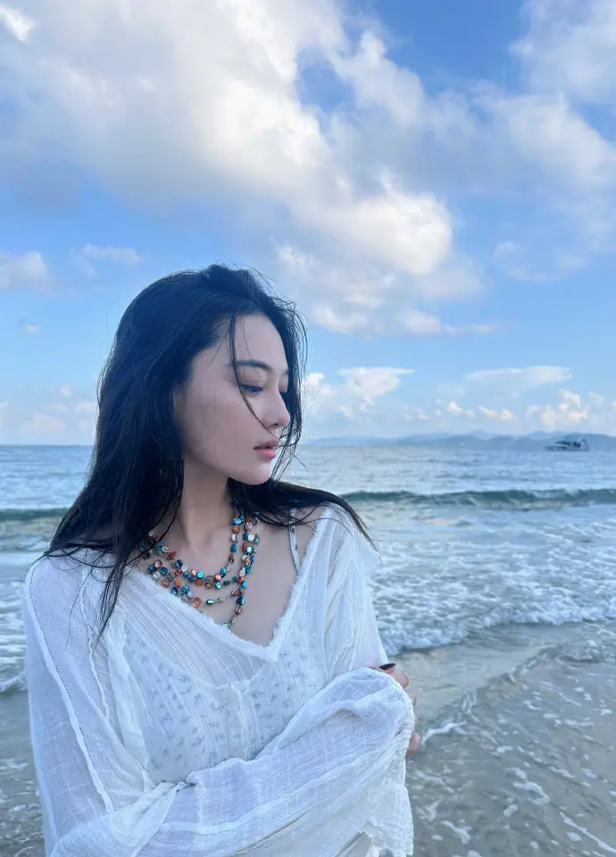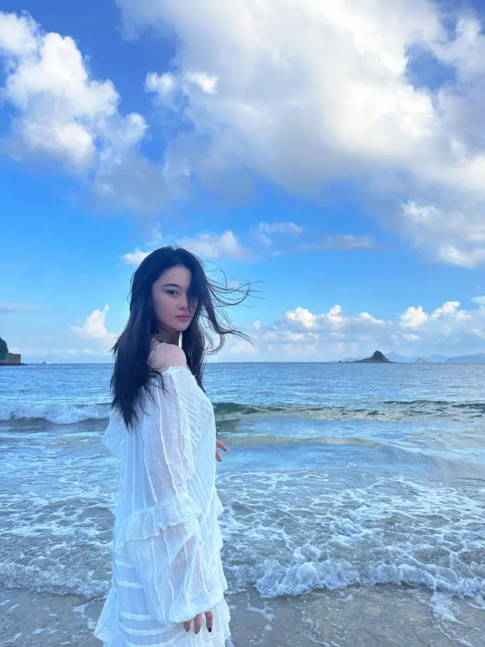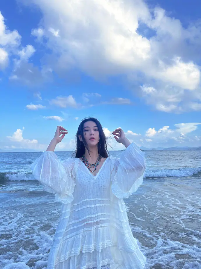 張馨予海邊回眸美艷大方 一身白衣清純動(dòng)人