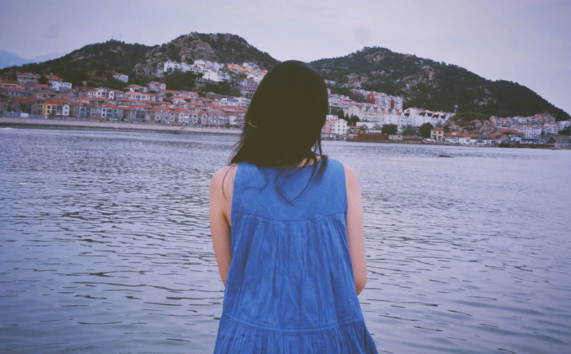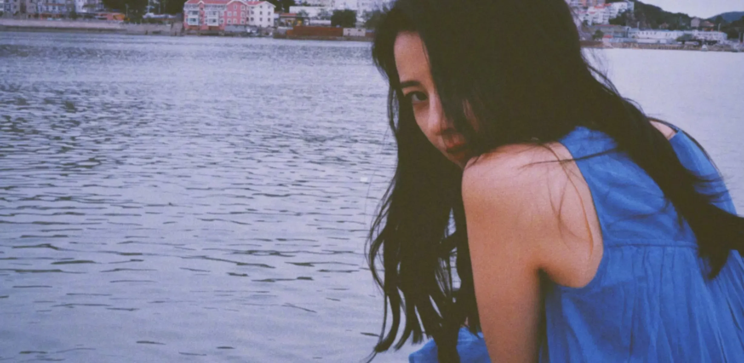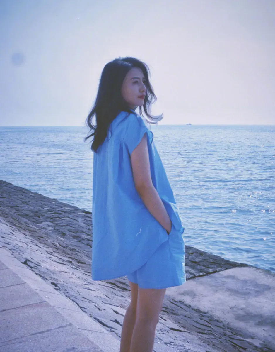 高圓圓穿藍(lán)色連衣裙和海邊適配度拉滿(mǎn)。