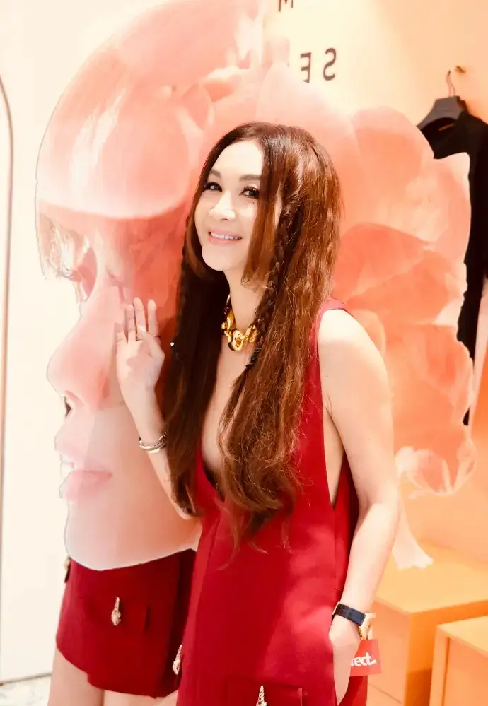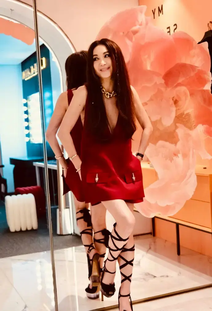 溫碧霞曬出活動造型寫真,一襲深V紅裙身材性感豐腴。