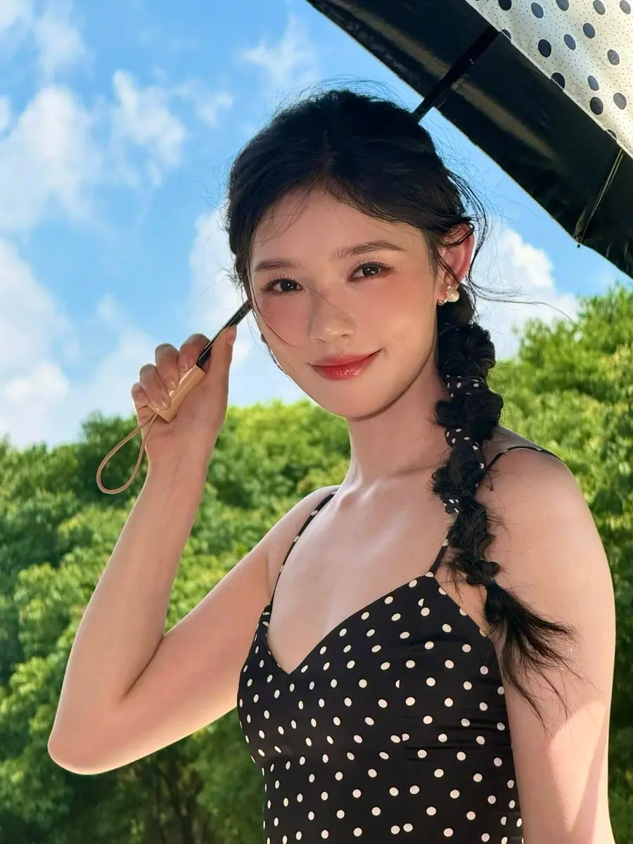 林允曬戶外美照元?dú)鉂M滿!穿黑色波點(diǎn)吊帶裙秀好身材