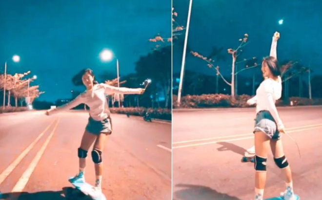 35歲趙奕歡手拿煙花玩滑板,一雙長腿似筷子