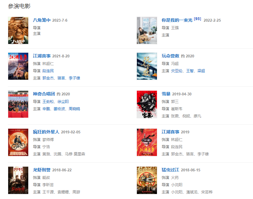 2015年參演賀歲電影《老炮兒》。2016年參加北京衛(wèi)視跨界喜劇競(jìng)技秀《跨界喜劇王》 [8] ,9月23日領(lǐng)銜主演的喜劇電影《三個(gè)孬家伙》上映。