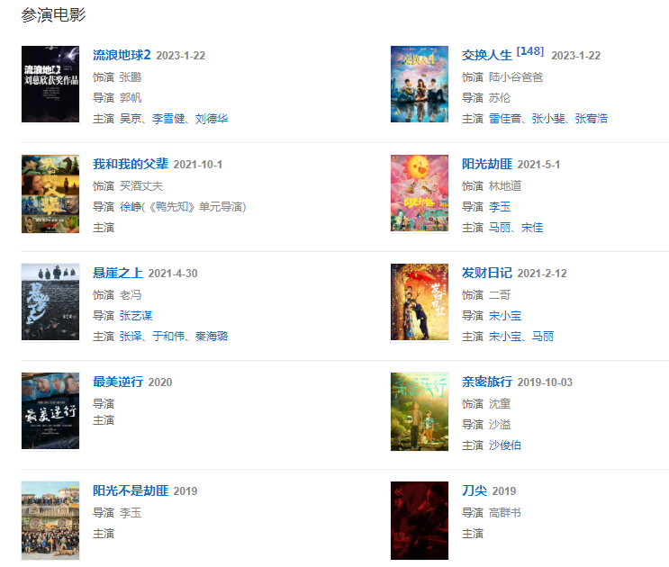 代表作品:武林外傳、炊事班的故事、血戰(zhàn)長空、結(jié)婚前規(guī)則、青盲、滲透、秀才遇到兵、甜蜜蜜、平凡歲月