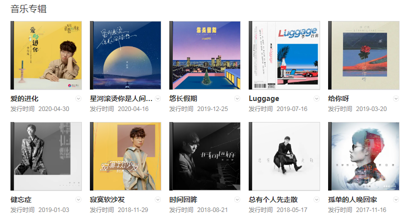 2020年,02月03日發(fā)行歌曲《天使的背影》;同年發(fā)行網(wǎng)劇《醫(yī)妃難囚3》片尾曲《洛緣訣》;同年發(fā)行歌曲《江城》;4月16日發(fā)行歌曲《星河滾燙你是人間理想》;同年4月30日發(fā)行歌曲《愛(ài)的進(jìn)化》;同年07月09日發(fā)行歌曲《愛(ài)不到的你》;同年10月12日發(fā)行歌曲《路人而已》。