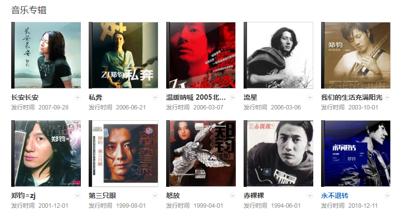 1994年在紅星生產(chǎn)社發(fā)行第一張專輯《赤裸裸》。后又發(fā)行《第三只眼》、《怒放》、《鄭鈞=zj》、《我們的生活充滿陽光》、《長安 長安》等多張專輯。2004年獲得第4屆百事音樂風云榜年度最佳搖滾男歌手獎。2013年4月,擔任湖南衛(wèi)視主推的勵志音樂類真人秀節(jié)目《中國最強音》的音樂導師(與羅大佑、陳奕迅、章子怡)。