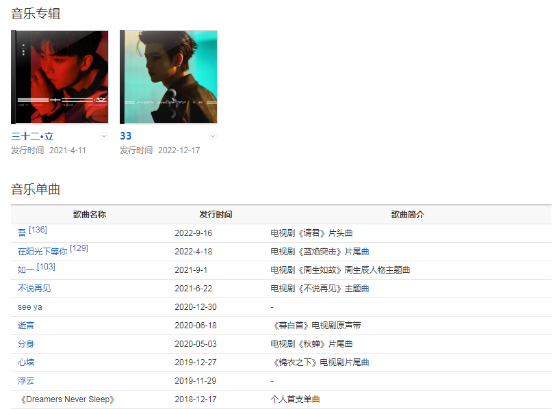 2021年在央視春節(jié)聯(lián)歡晚會(huì)表演小品《每逢佳節(jié)被催婚》。同年主演古裝劇《馭鮫記之與君初相識(shí)》。4月11日發(fā)行第一張個(gè)人專輯《三十二·立》,上線五分鐘銷量突破50萬(wàn),創(chuàng)QQ音樂(lè)“鉆石唱片”記錄。