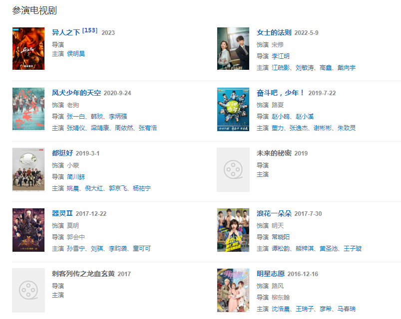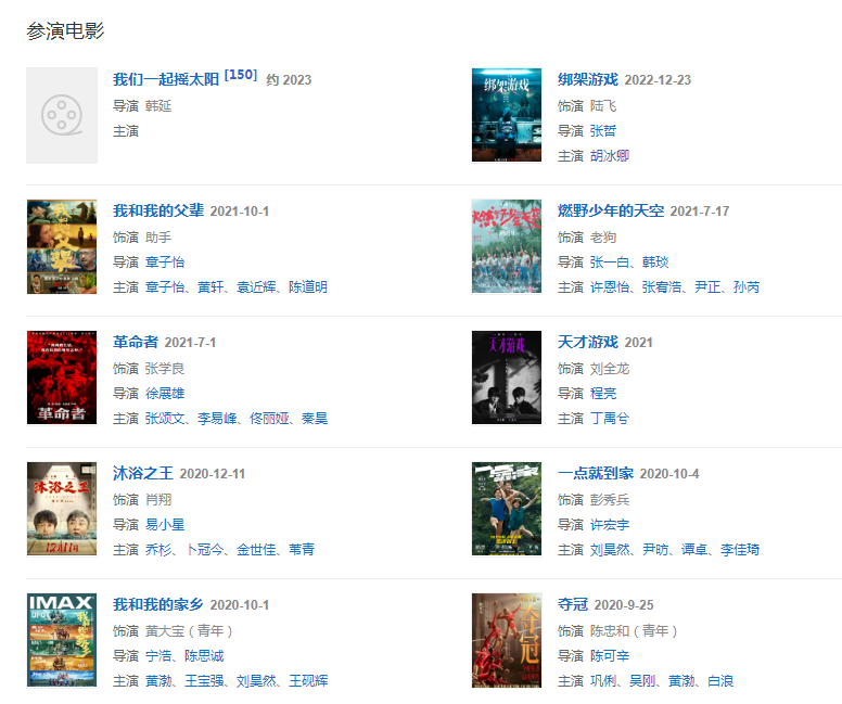 代表作品:快把我哥帶走、風(fēng)犬少年的天空、大象席地而坐、奮斗吧,少年!、閃光少女、都挺好、奪冠、一點就到家、刺客列傳