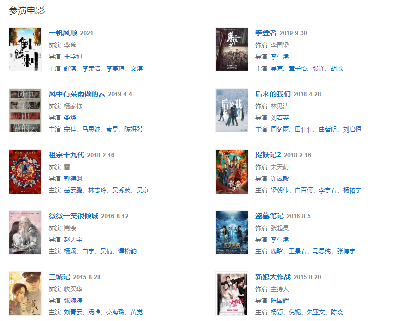 代表作品:捉妖記、失孤、風中有朵雨做的云、相愛穿梭千年、攀登者、全城熱戀、后來的我們、等風來