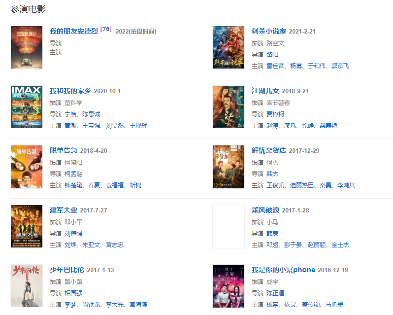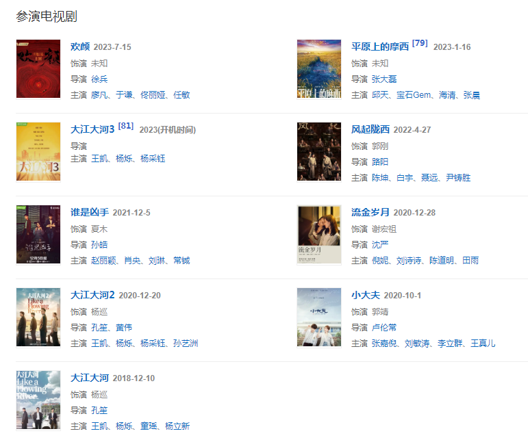 代表作品:青春派、山河故人、大江大河、六弄咖啡館、少年班、乘風破浪、流金歲月、恰好是少年