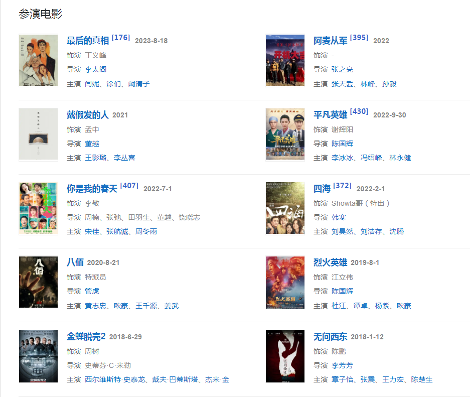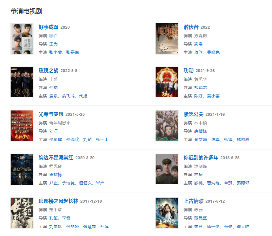 代表作品:中國合伙人、風聲、烈火英雄、無問西東、大唐玄奘、大上海、撒嬌女人最好命、大漢天子、神雕俠侶、新上海灘、暗香、精忠岳飛、鬢邊不是海棠紅、暗戀、什么都可以、緣、精忠傳奇、就算沒有明天、瑯琊榜之風起長林、趙氏孤兒