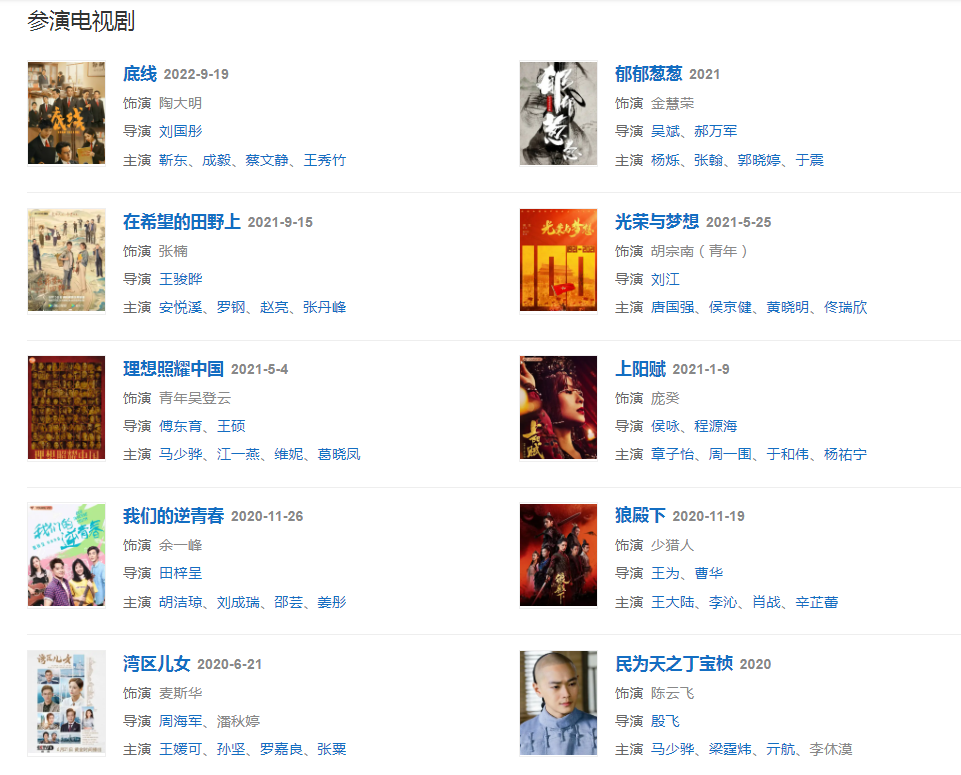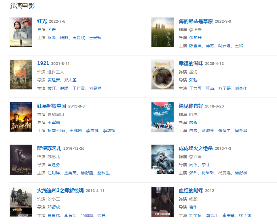 2021年5月25日,出演的重大革命歷史題材劇《光榮與夢想》在北京衛(wèi)視、東方衛(wèi)視及騰訊視頻、愛奇藝、優(yōu)酷同步播出 ;9月15日,與安悅溪主演的電視劇《在希望的田野上》在騰訊視頻播出;參演電影《1921》; 參演電視劇《理想照耀中國》。