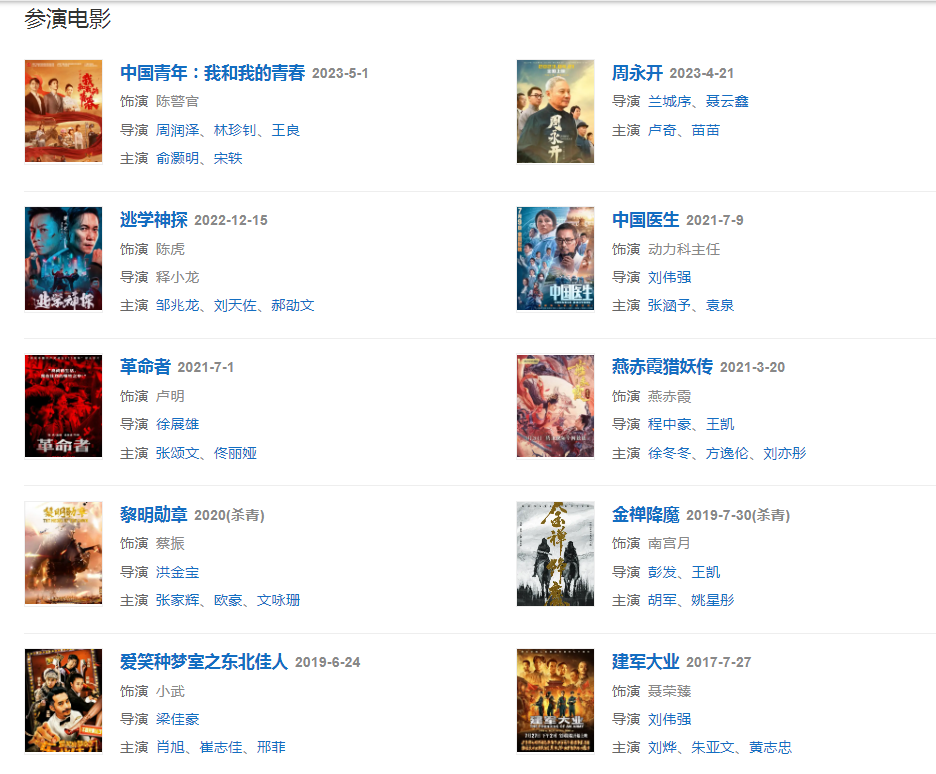 2017年,參演主旋律電影《建軍大業(yè)》,飾演聶榮臻 。