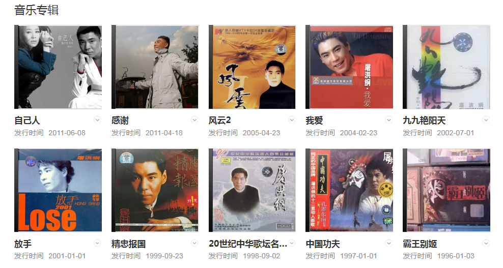代表作品:霸王別姬、中國功夫、精忠報國、藏龍臥虎、孔雀東南飛、江山無限、你、風(fēng)云、對酒當(dāng)歌、我的心、獨占瀟灑、咱們結(jié)婚吧