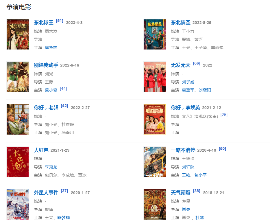 2003年出演電視劇《劉老根2》飾演宋禿子。