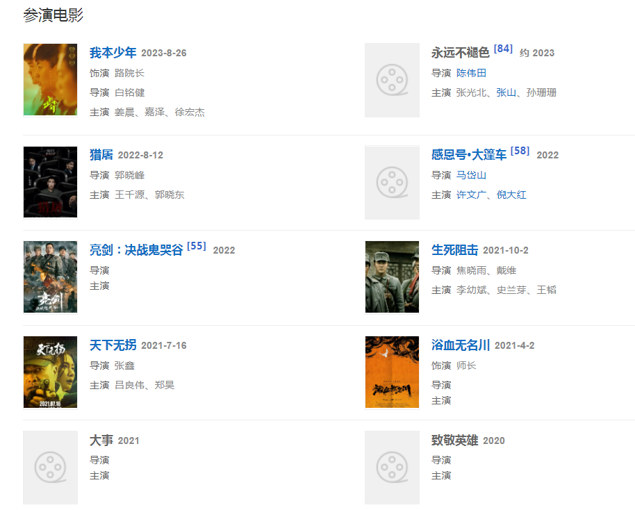 2021年4月2日,出演網(wǎng)絡(luò)電影《浴血無(wú)名川》定檔。2021年4月8日,戰(zhàn)爭(zhēng)歷史電影《生死阻擊》 。2021年12月,擔(dān)任第32屆華鼎獎(jiǎng)評(píng)委。