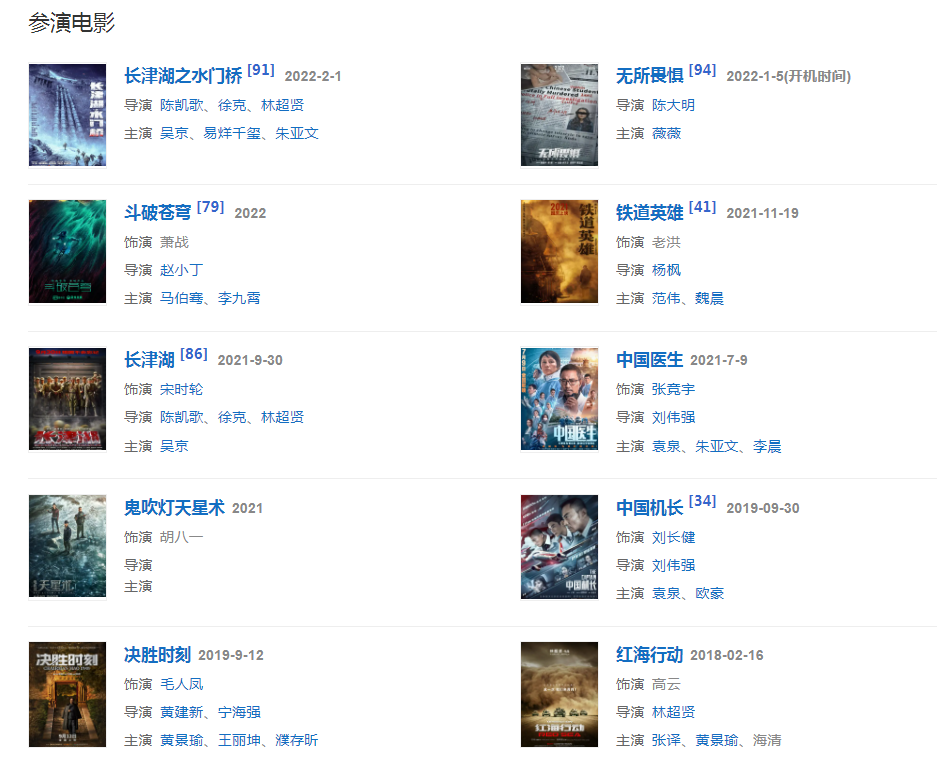 2022年1月5日,主演的犯罪懸疑動(dòng)作電影《無(wú)所畏懼》開(kāi)機(jī);2月1日,主演的電影《長(zhǎng)津湖之水門(mén)橋》上映。