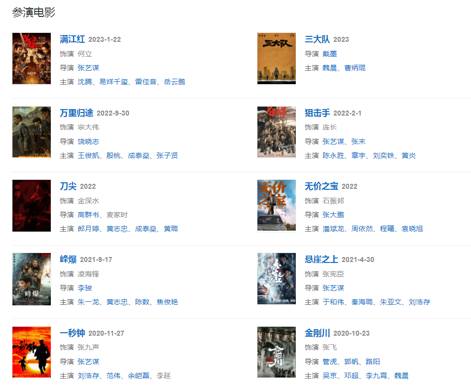 代表作品:紅海行動、一秒鐘、懸崖之上、山河故人、攀登者、金剛川、追兇者也、親愛的、士兵突擊、雞毛飛上天、重生之門、好家伙、生死線、我的團長我的團