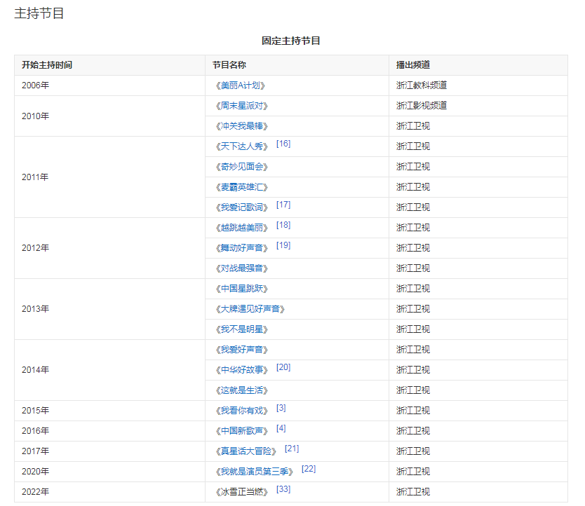 2016年,出任浙江衛(wèi)視勵(lì)志音樂(lè)評(píng)論節(jié)目《中國(guó)新歌聲》主持人。2017年,以補(bǔ)位嘉賓加盟 [12] 《花漾夢(mèng)工廠》第二季。