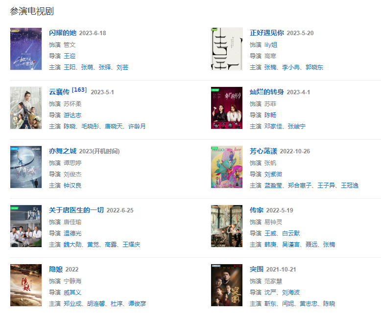 代表作品:還珠格格第三部:天上人間、又見(jiàn)一簾幽夢(mèng)、延禧攻略、怪你過(guò)分美麗、大唐女將樊梨花、深宅、一肩之隔、繡娘蘭馨、母語(yǔ)、王的盛宴