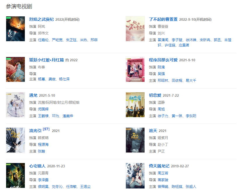 2019年,她主演的古裝武俠劇《倚天屠龍記》在騰訊視頻播出;同年,參加國內(nèi)首檔導(dǎo)演選角真人秀《演員請(qǐng)就位》。