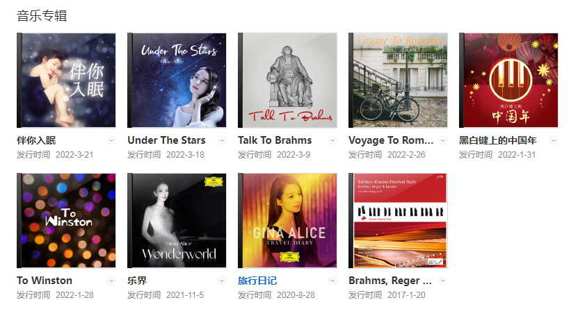 2022年5月20日,吉娜·愛麗絲的首張個人獨奏專輯《Wonderworld》(樂界)在北美上市。吉娜的丈夫郎朗擔任這張專輯的制作人。