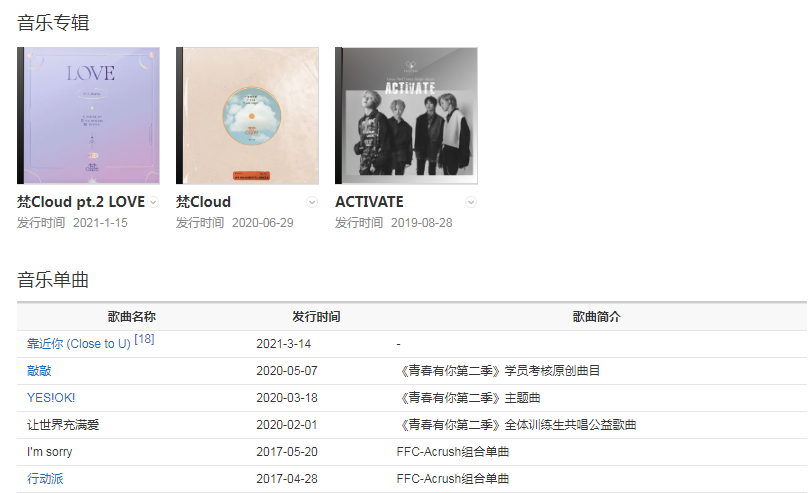 2020年1月,以訓(xùn)練生的身份參加愛奇藝女團青春成長節(jié)目《青春有你第二季》;6月,發(fā)行個人首張EP《梵Cloud》。2021年7月,參加騰訊視頻《黑怕女孩》并獲得最強廠牌 。
