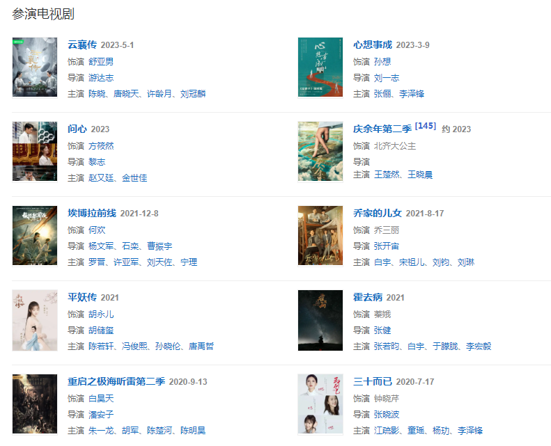 代表作品:三十而已、重啟之極海聽雷、甄嬛傳、天涯明月刀、微微一笑很傾城、錦繡未央、刀客家族的女人、喬家的兒女、重啟之極海聽雷
