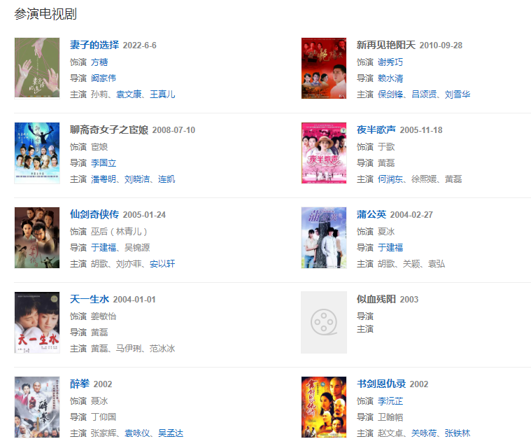 代表作品:仙劍奇?zhèn)b傳、聊齋奇女子、新再見(jiàn)艷陽(yáng)天、天地傳說(shuō)之魚美人