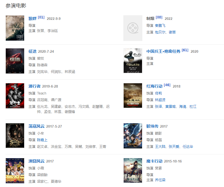 代表作品戰(zhàn)無雙、午夜出租車、蘇乞兒、紅海行動、特戰(zhàn)榮耀