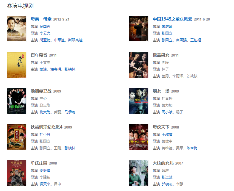 代表作品:母儀天下、牟氏莊園、永不瞑目、啼笑因緣、家在洹上、母親,母親、鐵齒銅牙紀(jì)曉嵐、大上海
