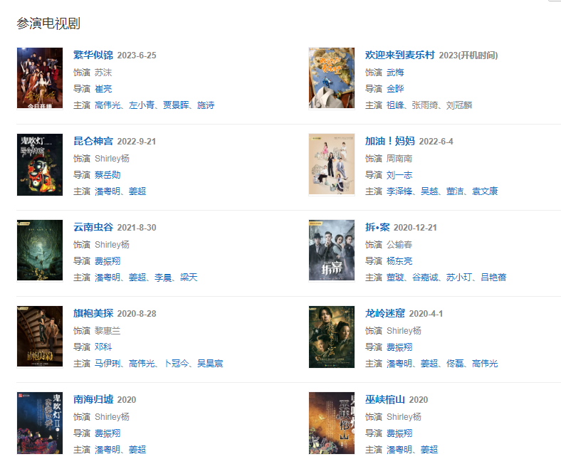 2020年4月1日,主演的探險(xiǎn)懸疑劇《龍嶺迷窟》正式開播,劇中飾演Shirley楊 。6月12日,參與芒果TV選拔綜藝《乘風(fēng)破浪的姐姐》,最終以第五名的成績(jī)成功成團(tuán)。10月30日,參與《乘風(fēng)破浪的姐姐》的成團(tuán)綜藝節(jié)目《姐姐的愛樂之程》。12月21日,特別出演的民國懸疑推理劇《拆·案》在愛奇藝獨(dú)家上線,劇中飾演醫(yī)生公輸春。12月31日,隨組合X-SISTER參演湖南衛(wèi)視跨年演唱會(huì),演唱歌曲《無價(jià)之姐》、《Lady Land》。同年,友情出演電視劇《旗袍美探》,飾演黎惠蘭。