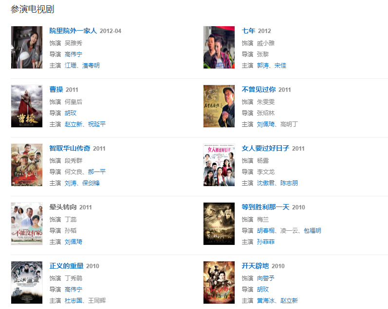 代表作品:大宅門(mén)第二部、漢武大帝、家比天大、開(kāi)天辟地、如此多嬌、一雙繡花鞋