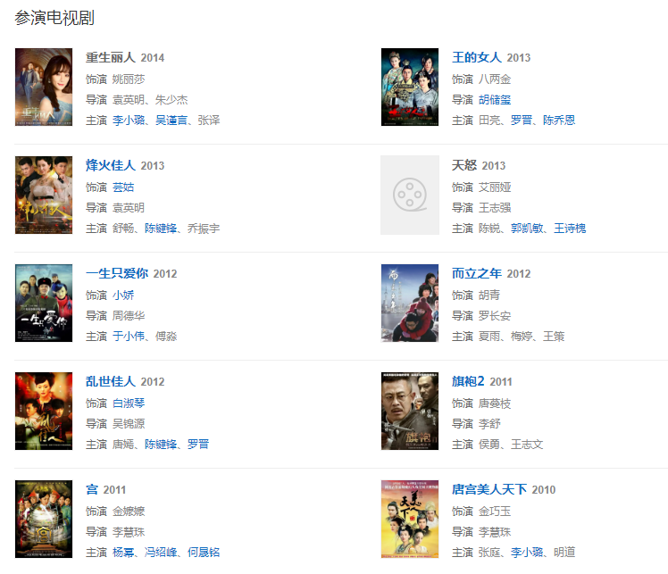 2012年在民國(guó)傳奇劇《亂世佳人》中飾演徐慧的秘書白淑琴。同年在民國(guó)年代感情劇《烽火佳人》中飾演一生執(zhí)愛(ài)沈之沛將軍的蕓姑。