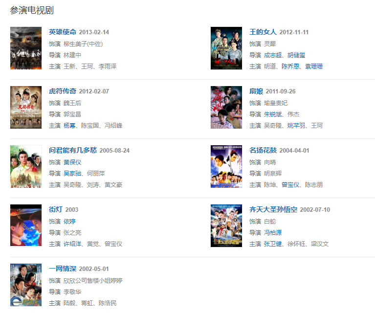 2003年,與許紹洋領(lǐng)銜主演青春偶像劇《街燈》,在劇中分飾依婷、夏雪、夏雪母三個角色。