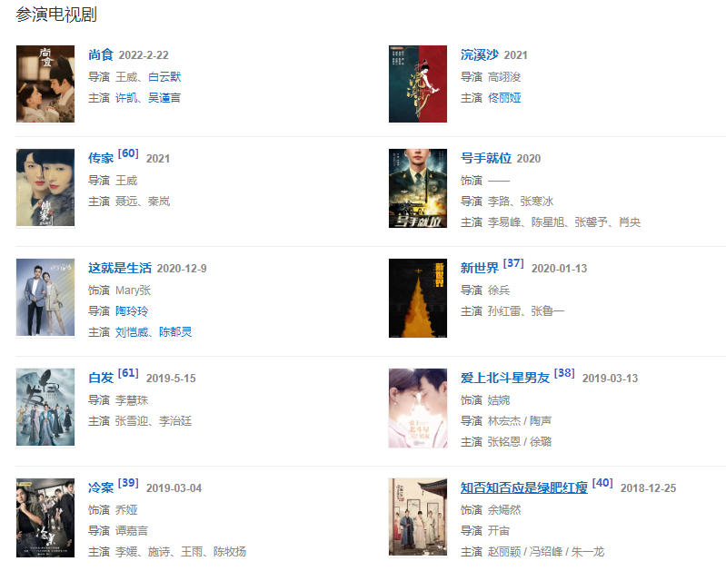 2017年,參演鞠覺亮執(zhí)導(dǎo)的古裝劇《孤芳不自賞》,在劇中飾演“張貴妃”一角 。2019年,參演古裝劇《白發(fā)》 。