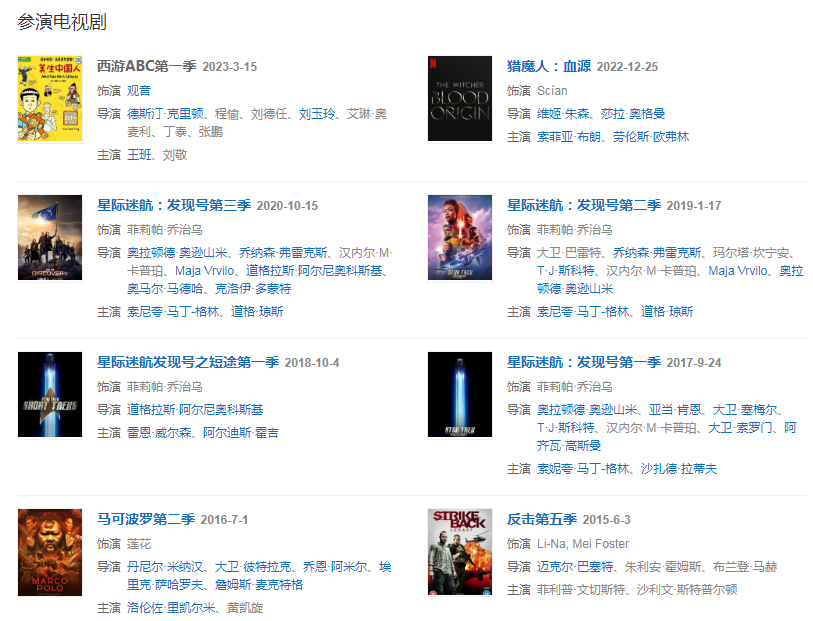 2015年,作為循環(huán)角色加盟Netflix的原創(chuàng)劇集《馬可波羅》(Maroc Polo)第二季。