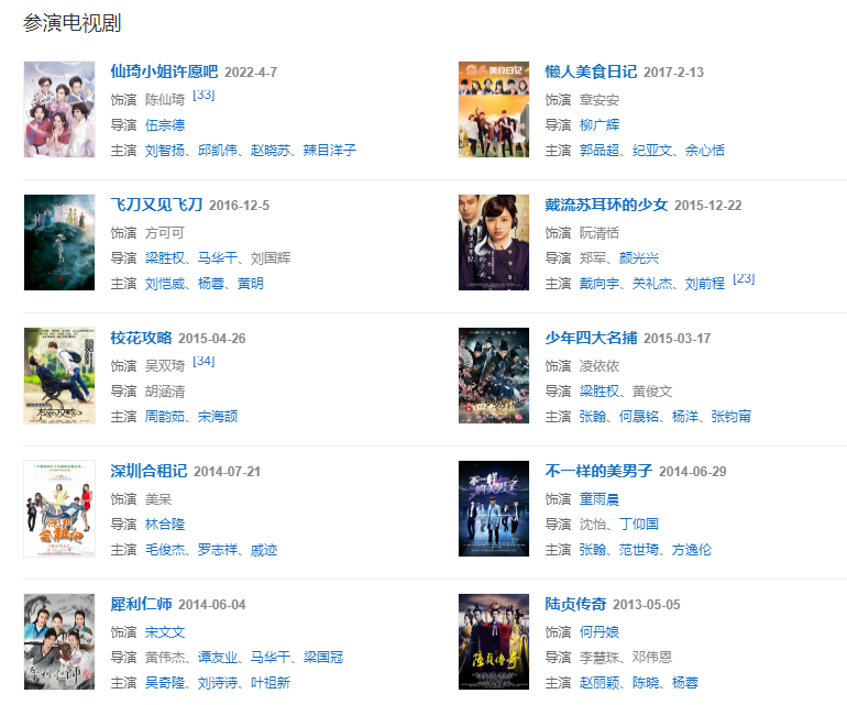2015年3月17日,參演的古裝劇《少年四大名捕》在湖南衛(wèi)視播出 ;同年主演民國(guó)愛(ài)情劇《戴流蘇耳環(huán)的少女》 。