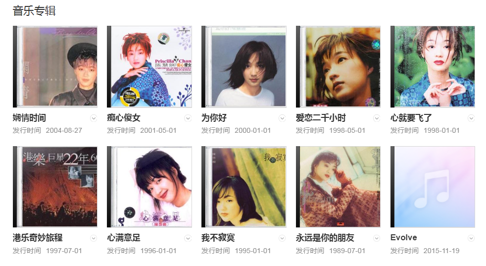 代表作品:千千闕歌、飄雪、紅茶館、歸來(lái)吧、逝去的諾言、孤單背影、玻璃窗的愛(ài)、傻女、人生何處不相逢、今天的愛(ài)人是誰(shuí)、月亮、多少柔情多少夢(mèng)、幾時(shí)再見(jiàn)、情意結(jié)